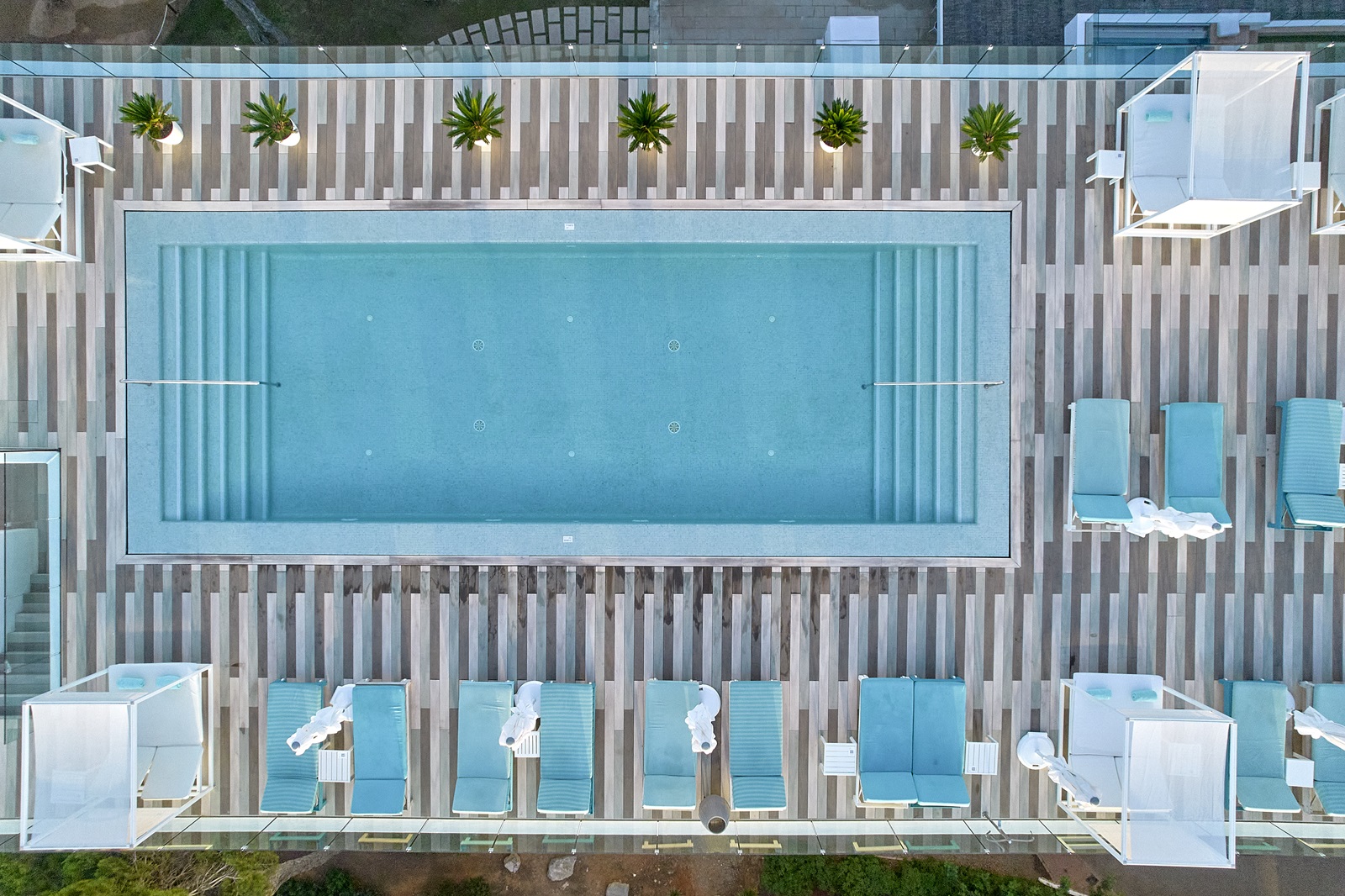 chaises longues, parasols et serviettes à la piscine