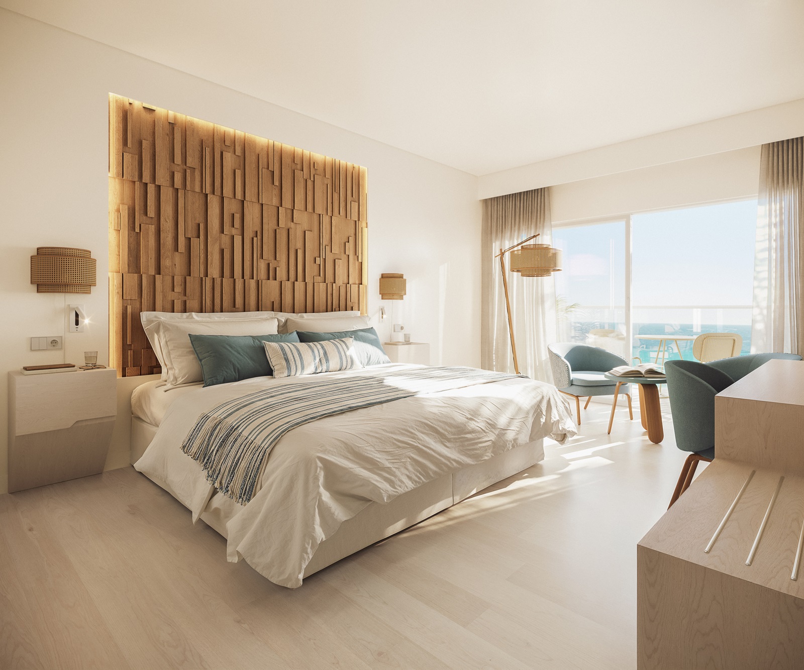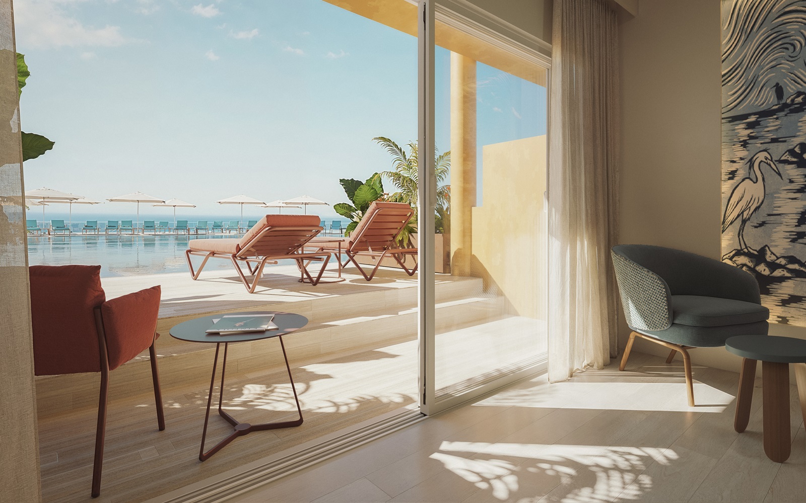chambres (32 m²) avec accès direct à une piscine commune et vue mer latérale