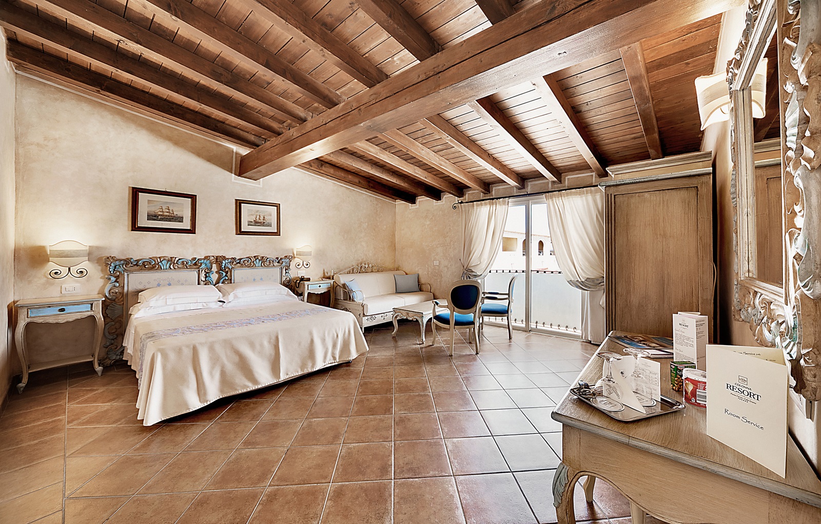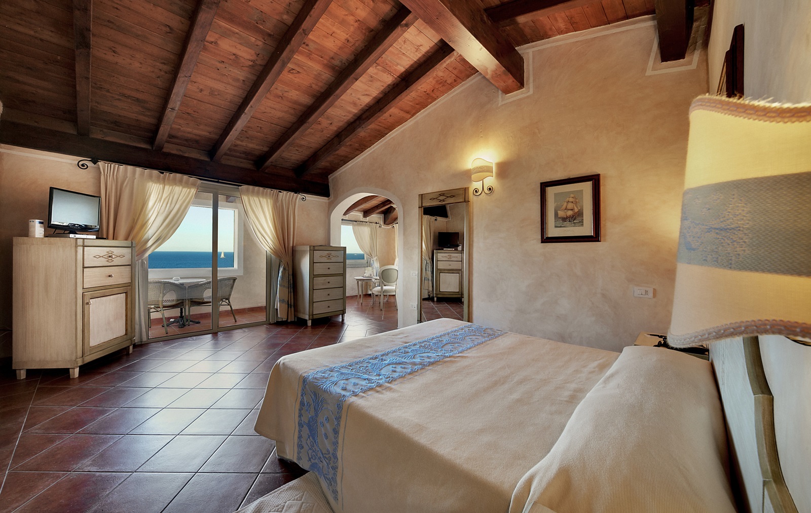 toutes les chambres meublées de façon classique dans le style sarde avec un sol en carrelage typique disposent d'une salle de bain (baignoire/douche, sèche-cheveux), télévision à écran plat, téléphone, wifi (gratuit), minibar (€), coffre-fort, climatisation et balcon ou terrasse