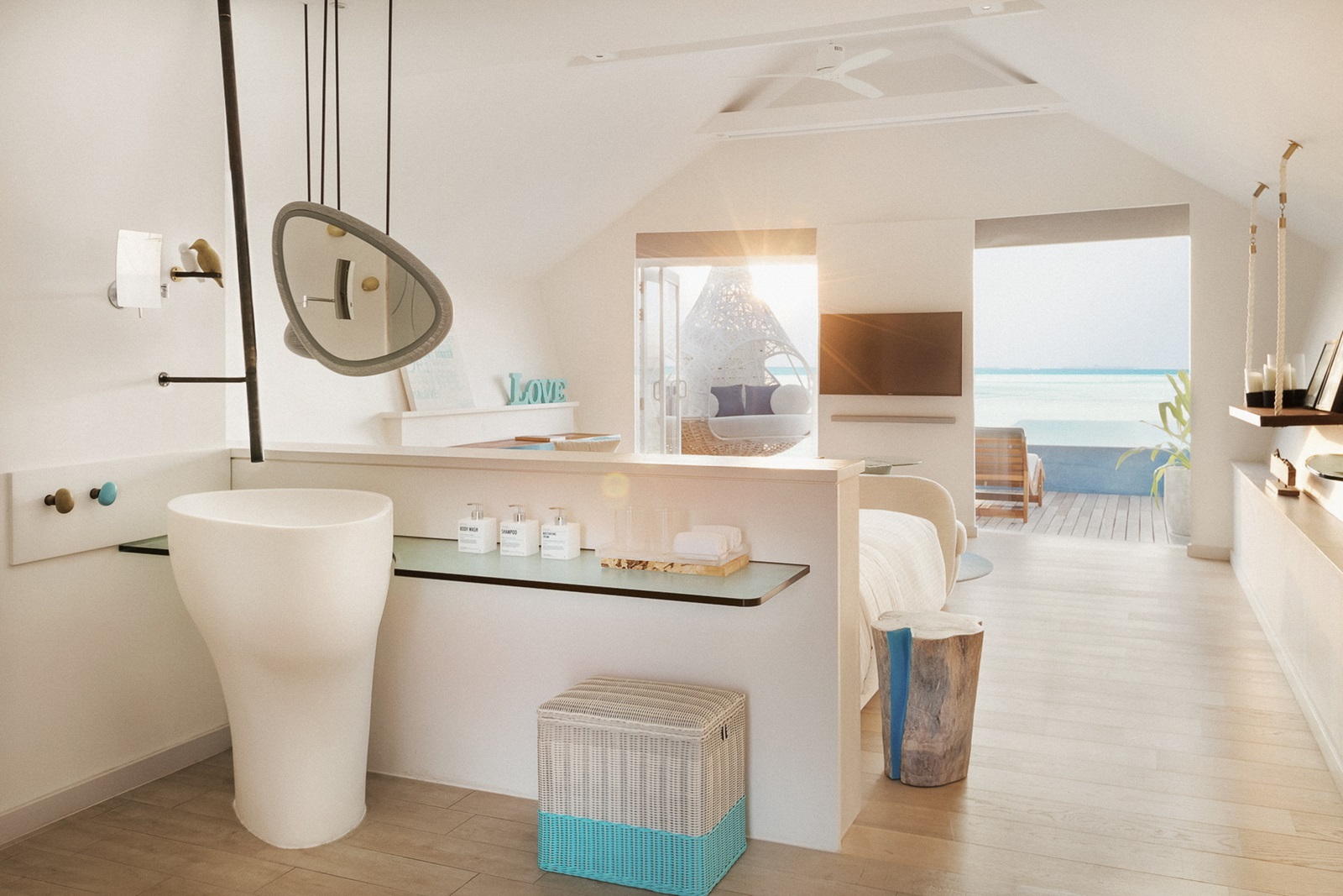 Overwater Infinity Pool Villa (110 m²) avec salle de bains ouverte, grande terrasse avec piscine à débordement privée et accès direct à la mer