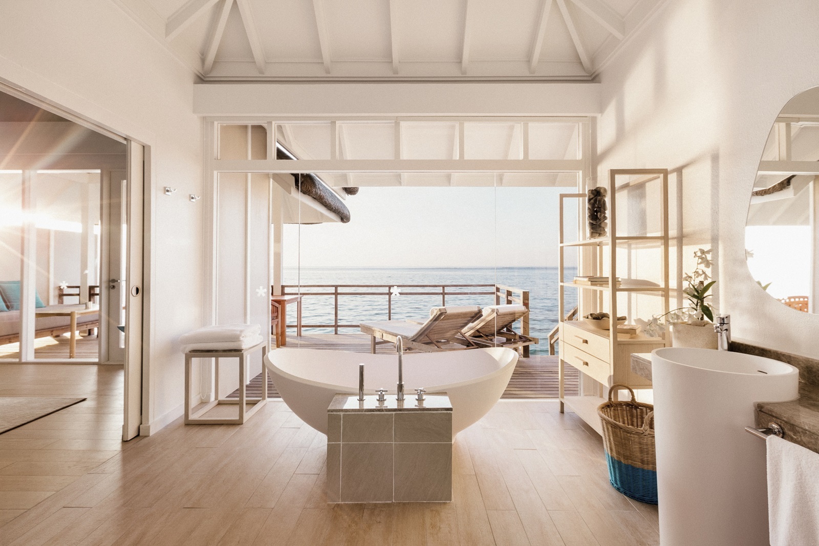 water villas (98 m²) avec belle salle de bain avec bain et vue mer et terrasse avec accès direct à la mer