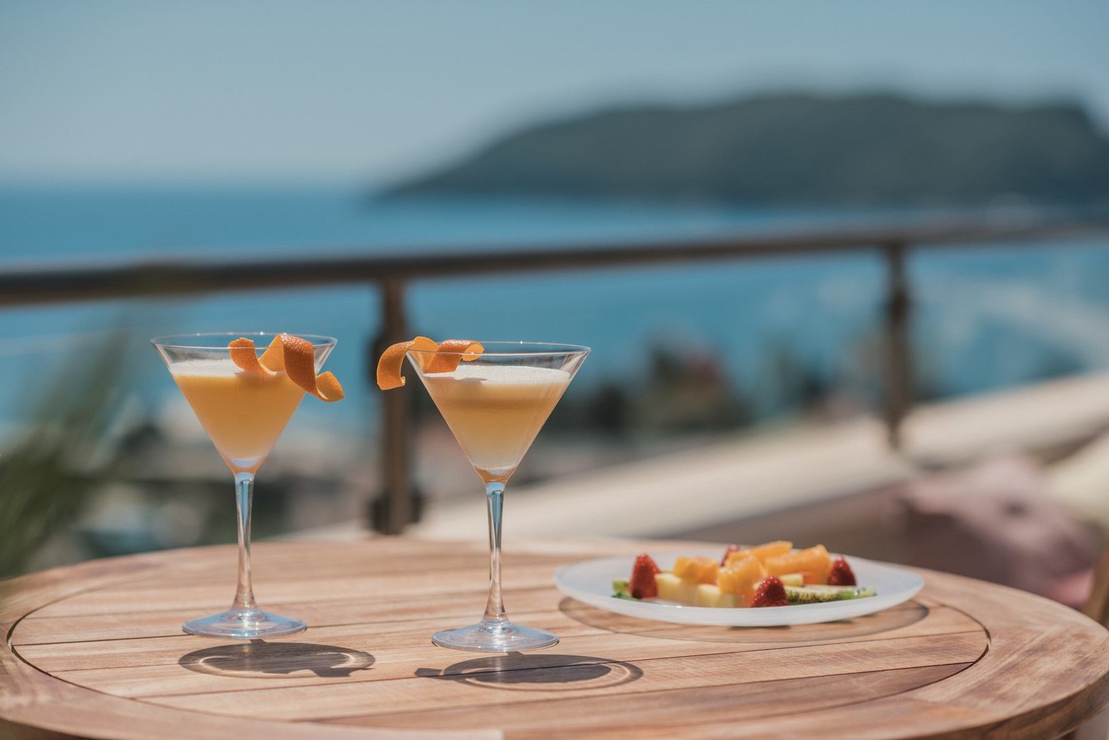 suites junior (48–53 m²) avec sejour/chambre à coucher spacieux avec divan-lit, salle de bains avec bain et douche, vue mer latérale, avec ou sans balcon