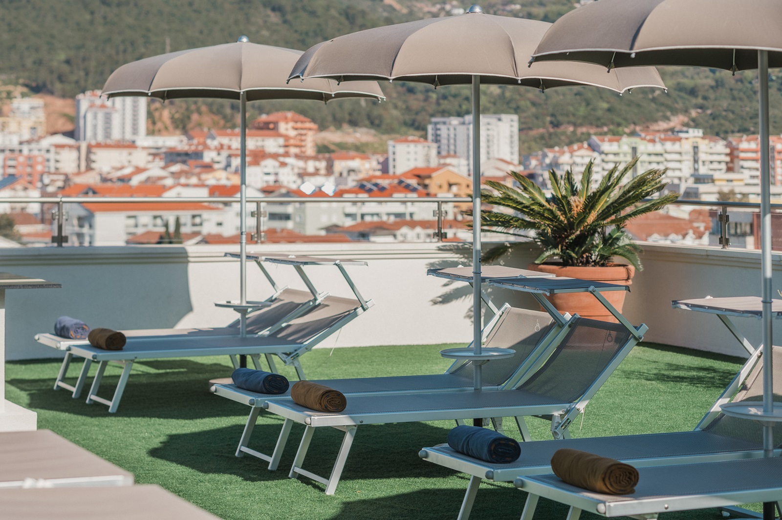 terrasse sur le toit au 9ème étage avec restaurant à la carte, bar de piscine et piscine à débordement avec chaises longues et parasols