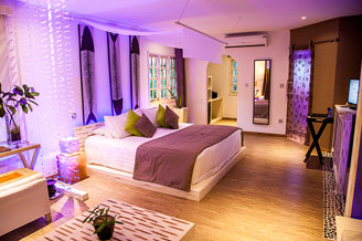 villas de charme élégance (100 m²) avec dressing, salle de bain extérieure (avec baignoire et douche) et terrasse plus spacieuse avec jacuzzi