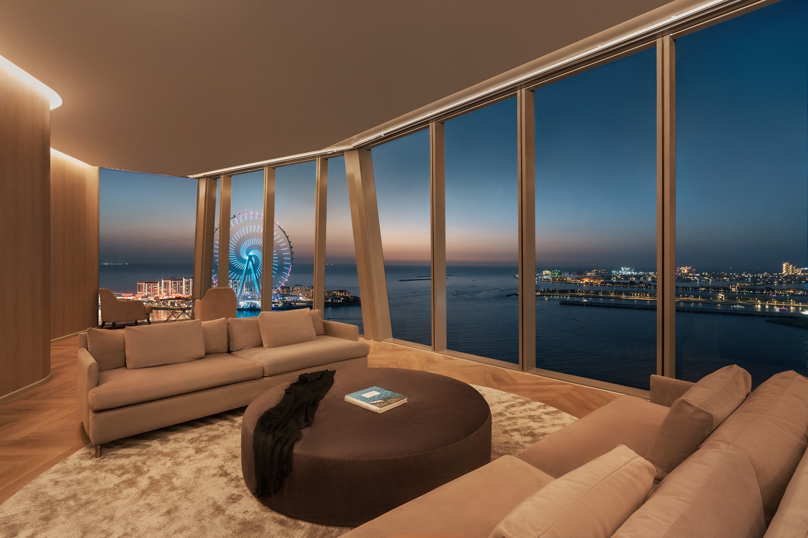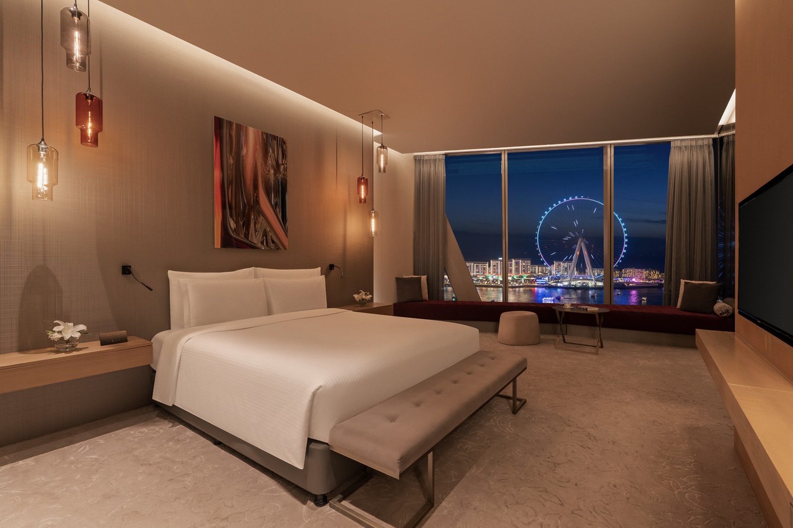 One Bedroom Premium suites (84-94 m²) avec salon spacieux, chambre à coucher séparée avec lit king-size et vue magnifique sur le golfe Arabique et Ain Dubaï.