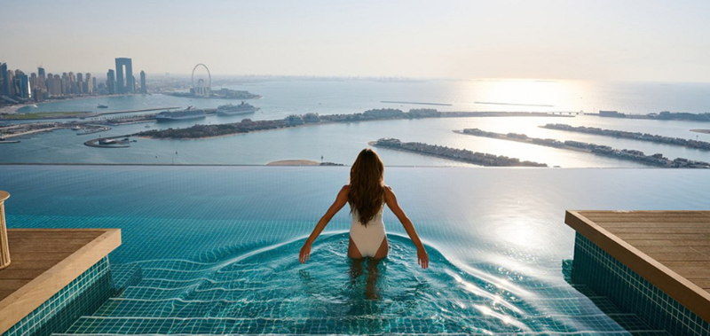 Tout est haut, très haut, toujours plus haut à Dubaï. Ce qui signifie qu'on y trouve aussi de nombreux rooftops extraordinaires dotés d'une piscine à débordement. C'est le cas de l'AURA SKyPool, la plus haute piscine à débordement à 360° du monde. Située au sommet de la Palm Tower, sur le célèbre chapelet des Palm Islands, elle flotte à pas moins de 200 mètres de haut et offre une vue imprenable sur la skyline emblématique de Dubaï.