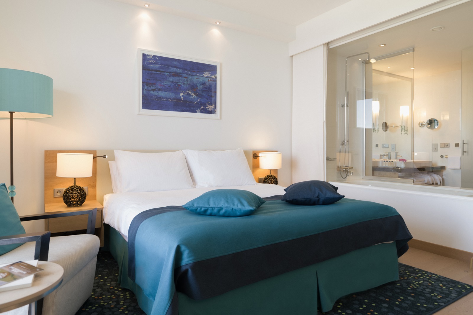 chambres avec bain/douche, sèche-cheveux, sorties de bain, climatisation, percolateur à café et thé, téléphone, wifi, TV satellite, coffre-fort, minibar, parquet, balcon ou terrasse, côté mer