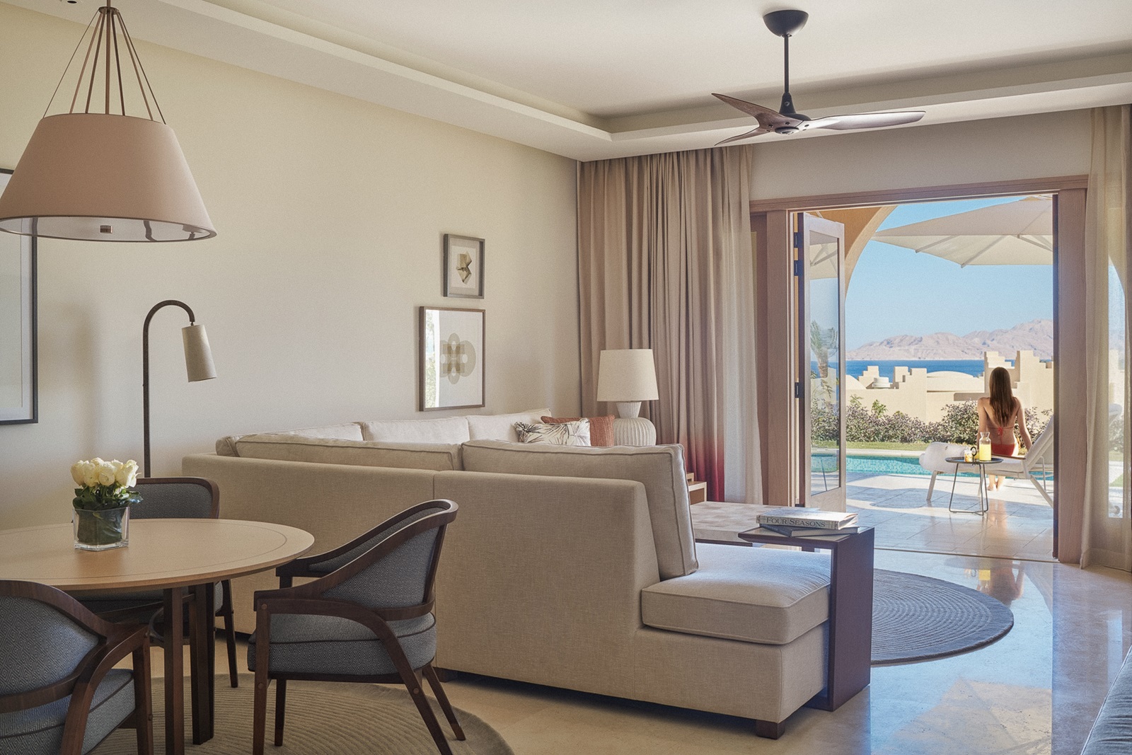 suites (120 m²) avec chambre à coucher séparée, salon spacieux, deuxième salle de bain (avec douche) et vue mer, également possible avec plunge pool et vue mer latérale/vue jardin
