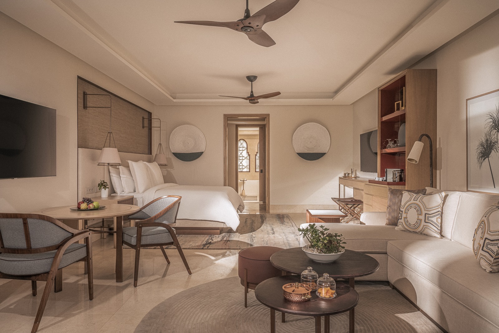 toutes les chambres spacieuses, luxueuses et de style arabe disposent d'une salle de bains en marbre (bain, douche, sèche-cheveux), coin salon spacieux, télévision à écran plat, machine à café Nespresso®, téléphone, wifi, minibar (€),coffre-fort, climatisation et balcon ou terrasse spacieuse