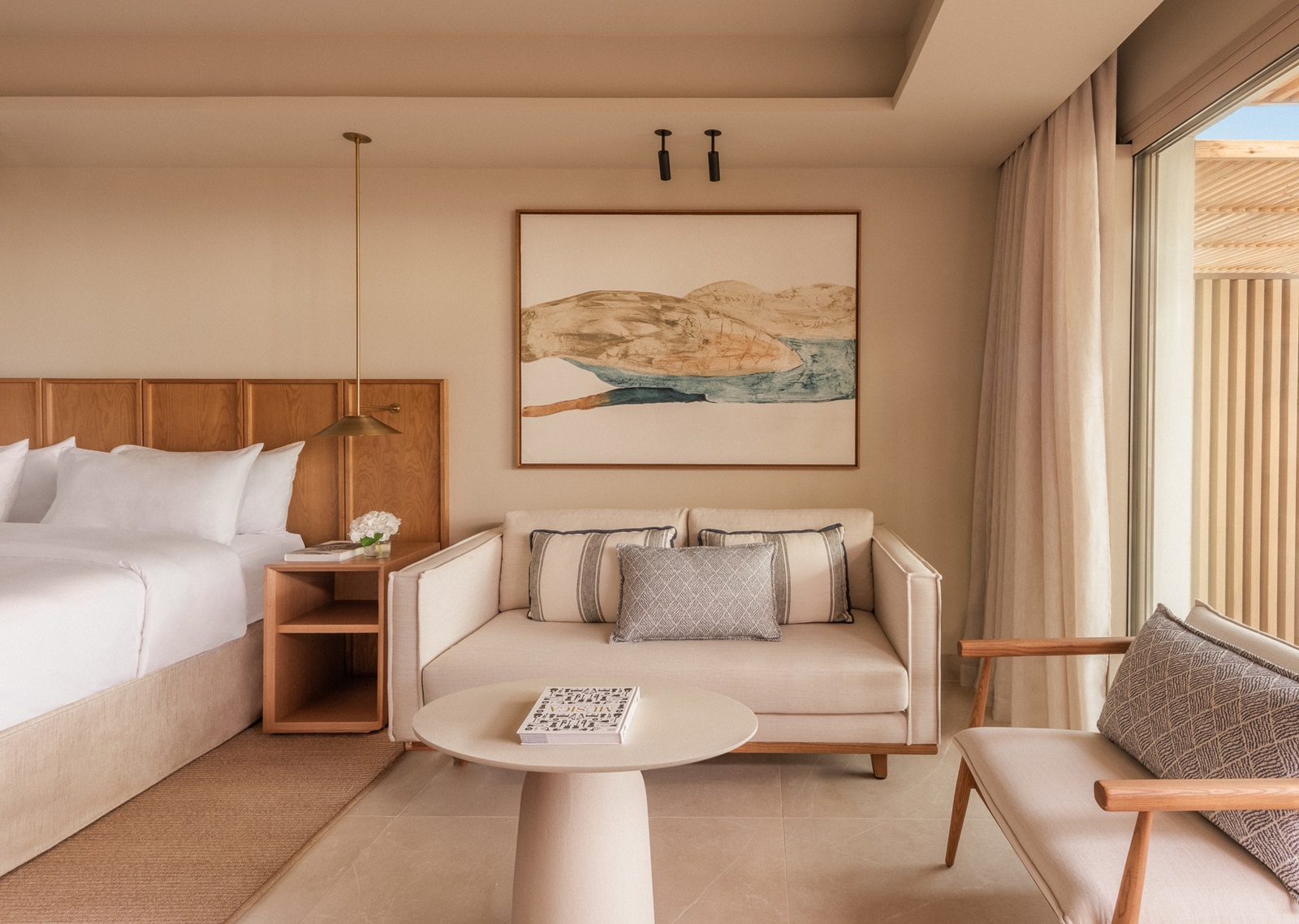 Mediterranean Suites (90 m²) avec séjour spacieux, chambre à couhcer séparée avec lit king-size et vue mer