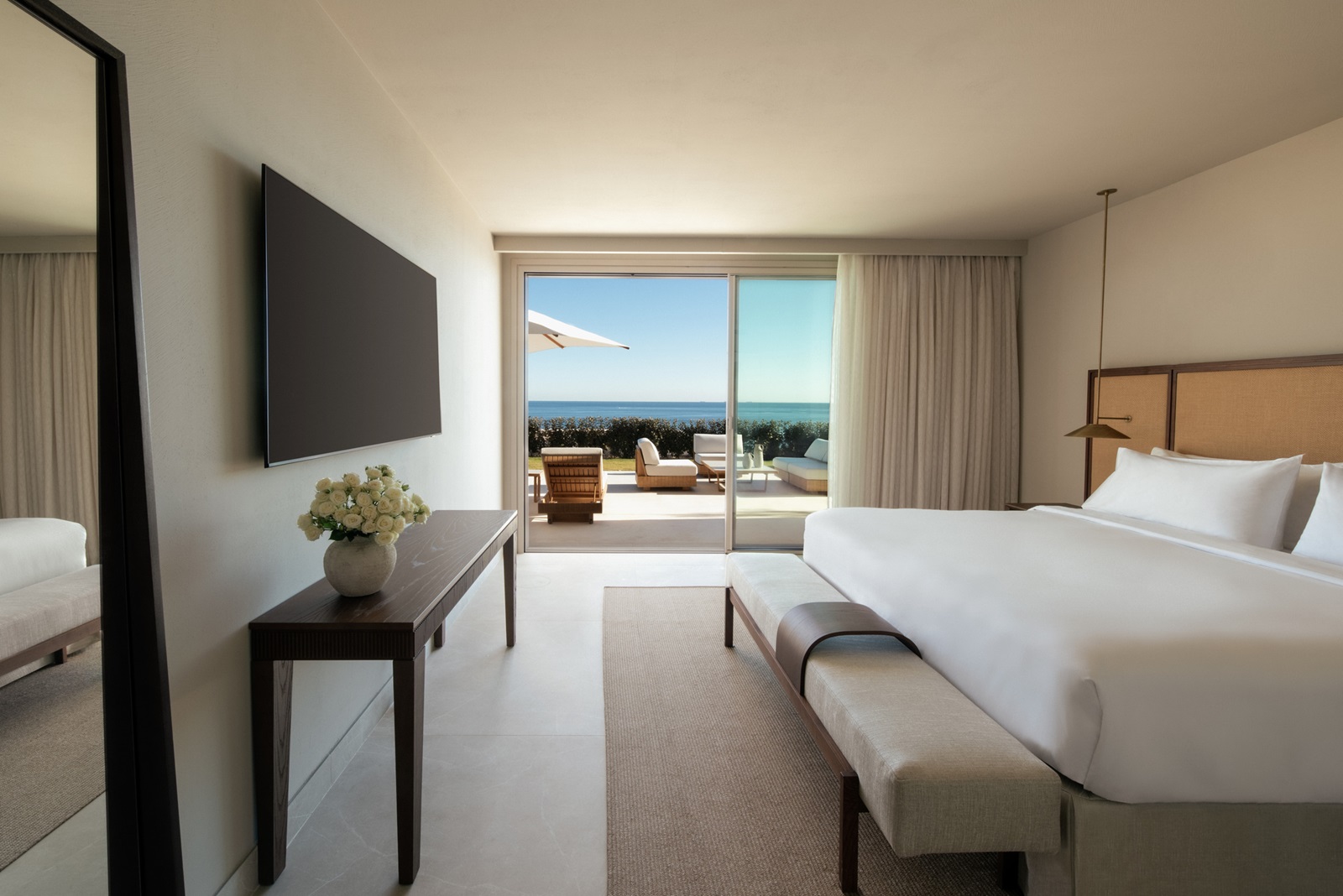 Mediterranean Pool suites (190 m²) avec séjour spacieux, chambre à coucher séparée avec lit king-size, terrasse avec chaises longues, plunge pool et vue mer