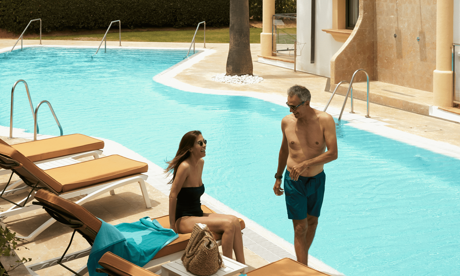 chaises longues, serviettes (caution) et parasols gratuits à la piscine