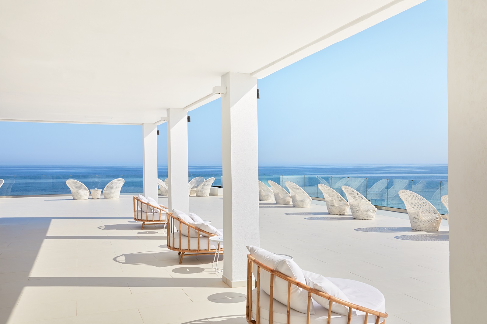 Lux.Me Yali Seafront Suite (54 m²) située sur la mer, avec bain et douche, chambre et séjour séparés par une porte coulissante, terrasse, accès direct à la piscine commune, jardin avec chaises longues