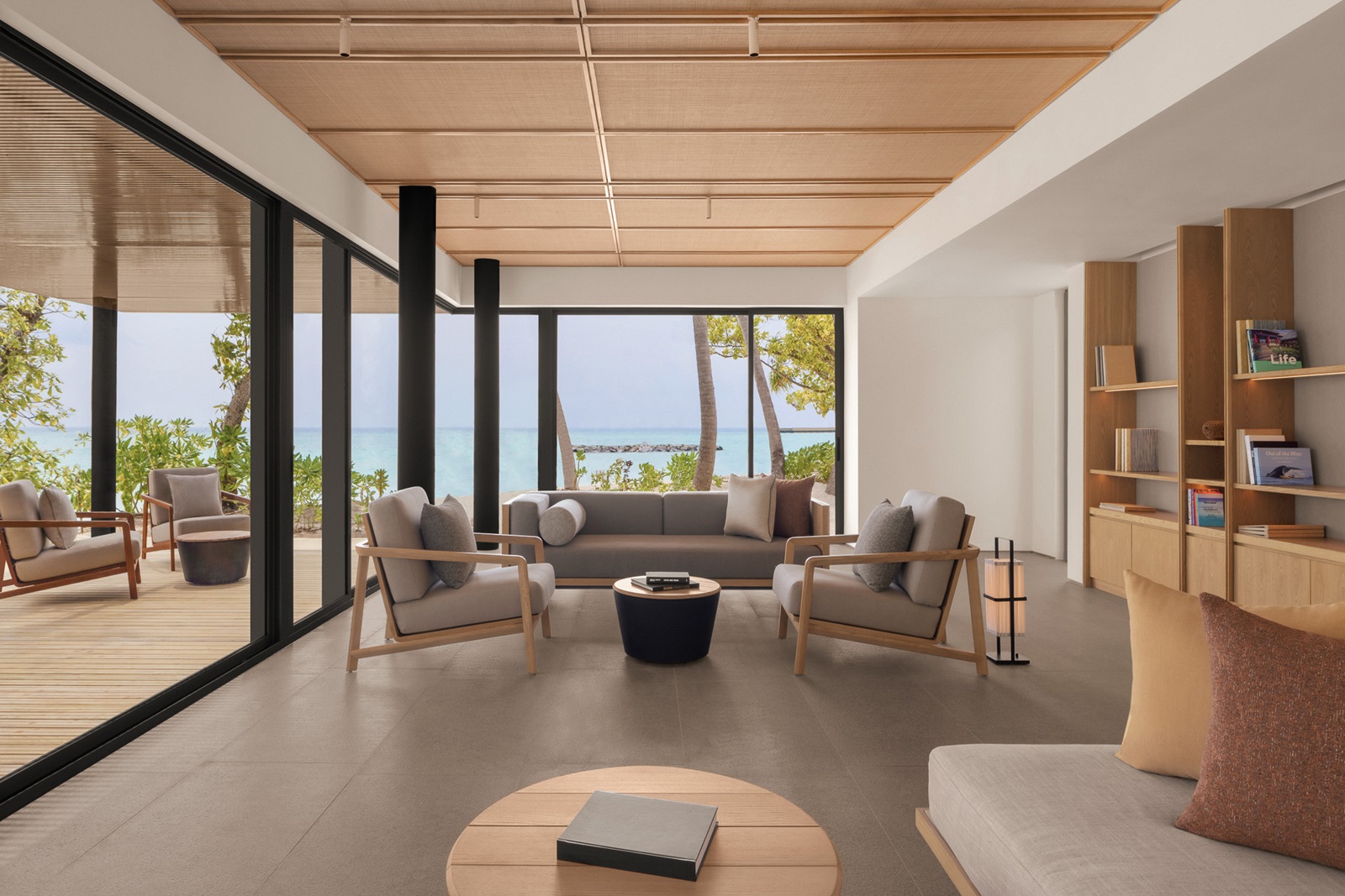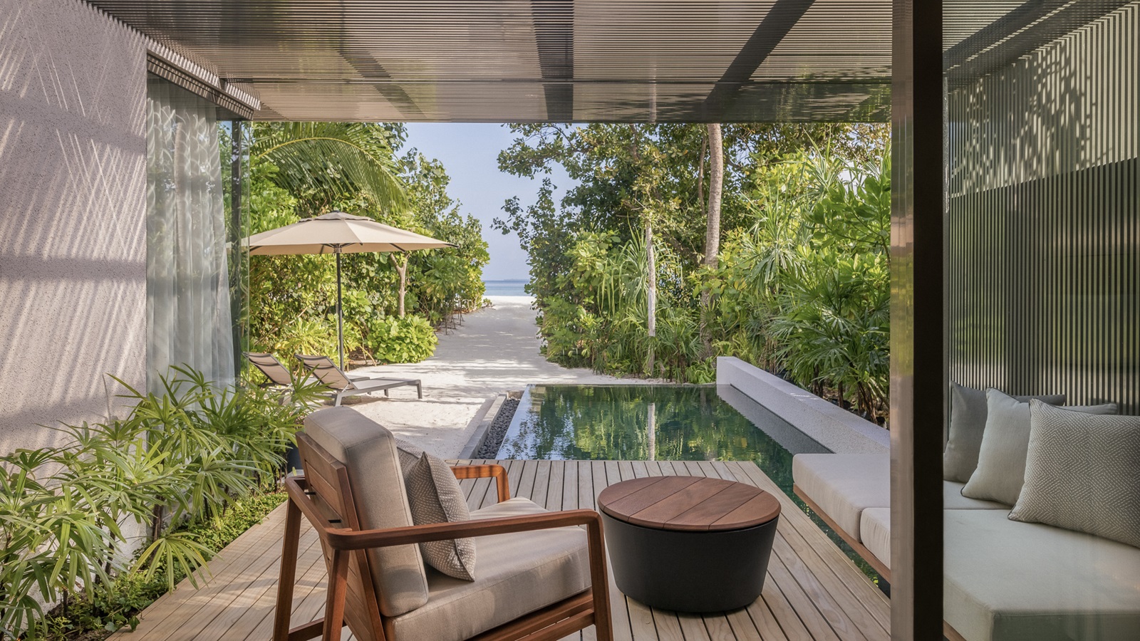 beach villas (202 m²) et sunset beach villas (202 m²) avec salon séparé, chambre à coucher et salle de bain spacieuse, en partie en plein air avec grande baignoire et douche extérieure supplémentaire et terrasse entourée de verdure avec accès à la plage