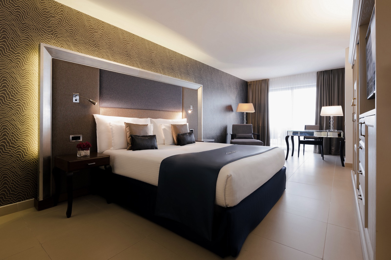 chambres de luxe (38 m²) avec bain ou douche, climatisation / chauffage, sèche-cheveux, téléphone, coffre-fort, peignoir, minibar, télévision par satellite, wifi, percolateur à café et thé, balcon