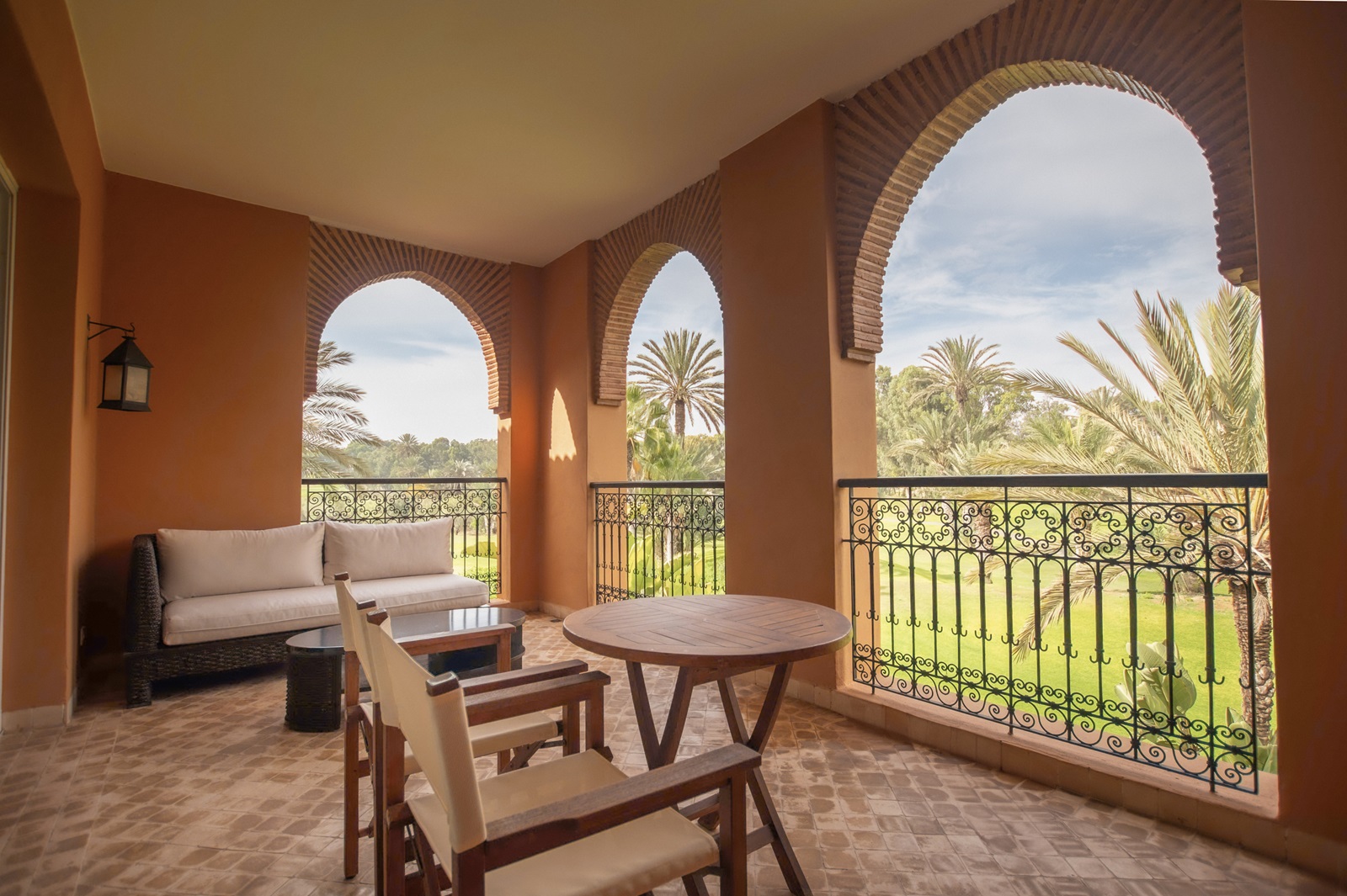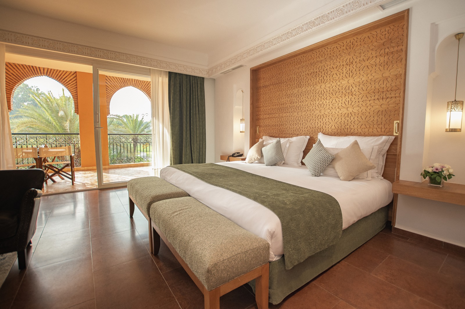 toutes les chambres luxueuses et spacieuses de style marocain avec des touches contemporaines disposent d'une salle de bain spacieuse (baignoire, douche, sèche-cheveux), téléphone, télévision à écran plat, minibar (€), coffre-fort, climatisation et balcon ou terrasse avec vue golf ou piscine