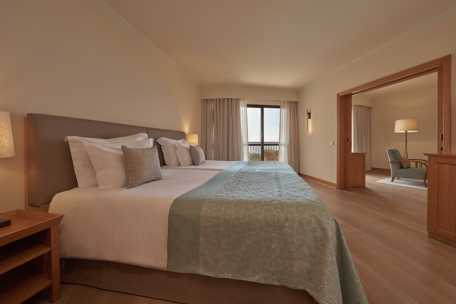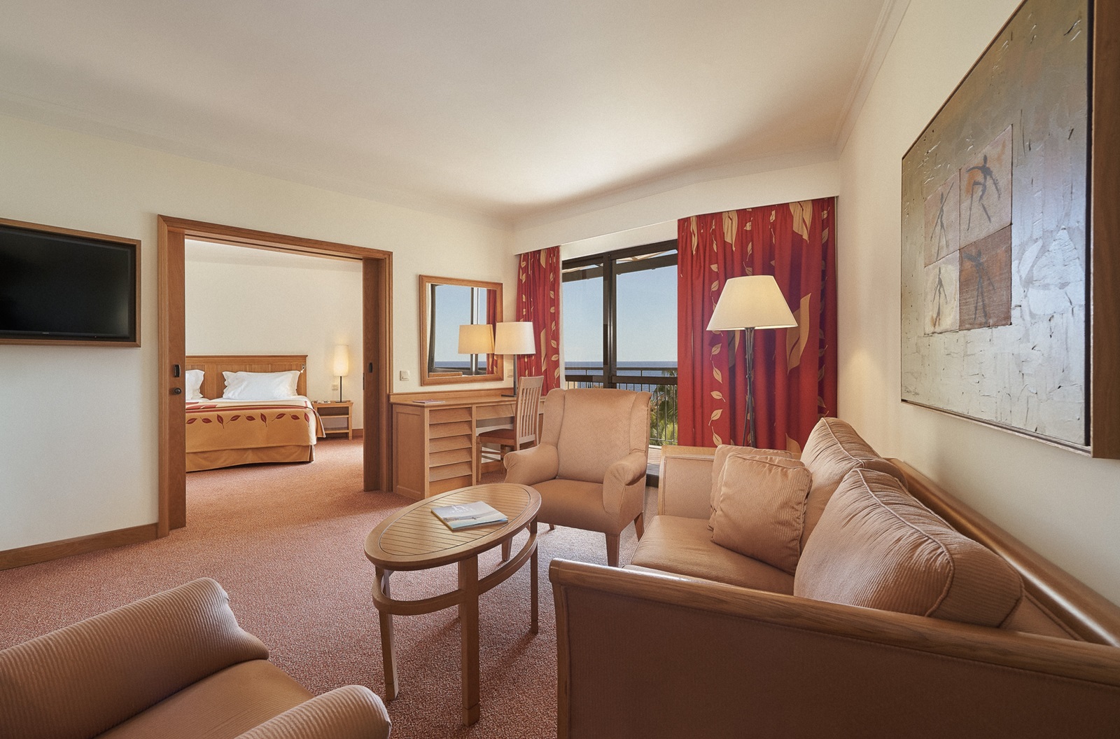 Suites junior (56 m²) avec chambre à coucher séparée, sejour avec kitchenette et coin repas séparée par une porte coulissante de la chambre à coucher, vue mer
