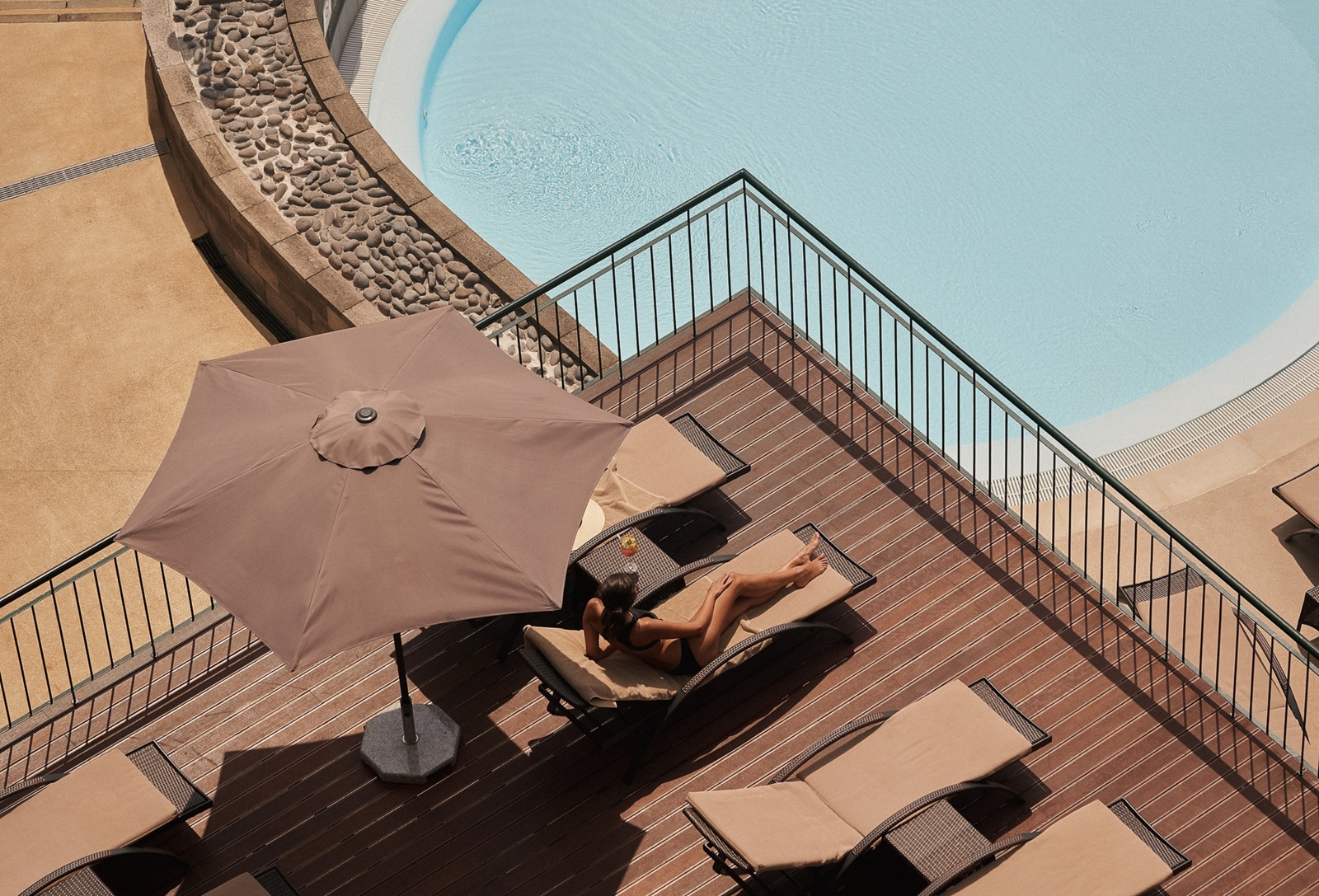 chaises longues, matelas, parasols et serviettes gratuits à la piscine
