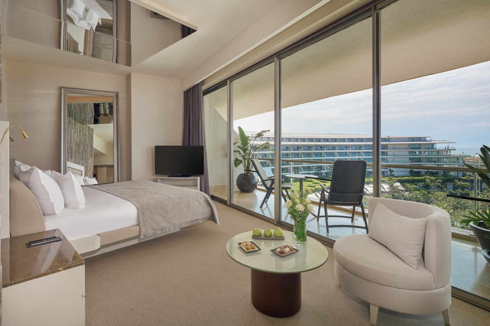 suites royales (100 m²) avec salon, chambre à coucher séparée, salle de bains avec jacuzzi, service de chambre gratuit, balcon et vue mer