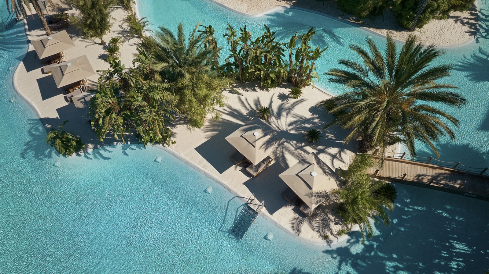 suites duplex lagon (135 m²) avec salon, 2 chambres à coucher séparées, 2 salles de bains (dont une avec jacuzzi), terrasse avec accès direct à la piscine commune, service de chambre gratuit et vue piscine