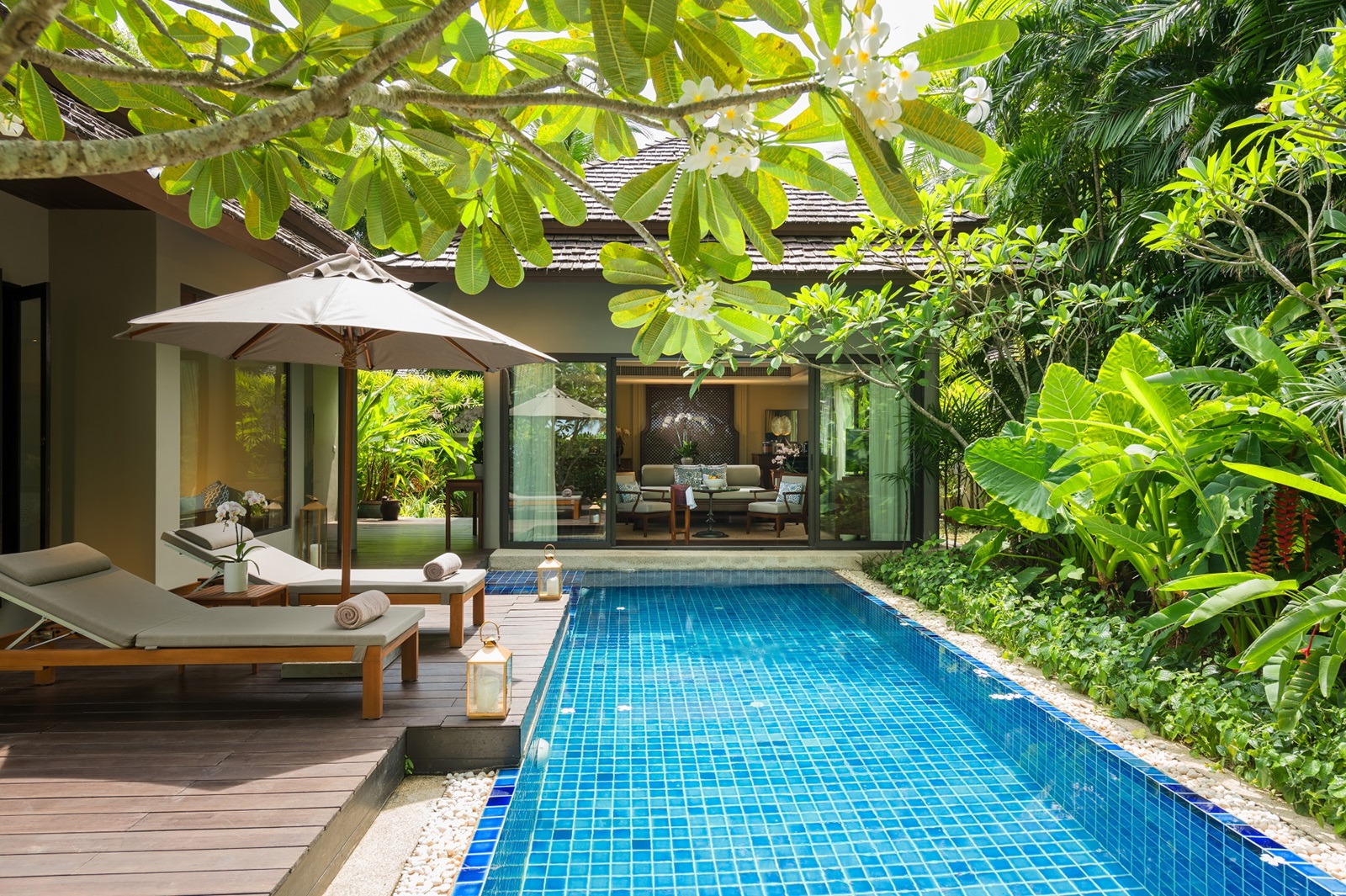 deluxe pool villa's (100 m²) met bad in openlucht, ruim terras met ligstoelen, privézwembad (5x3m)