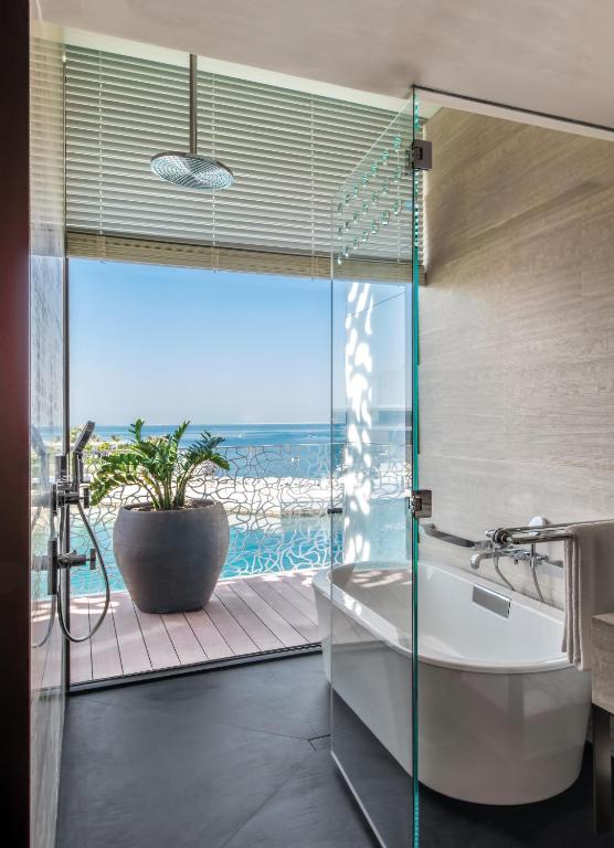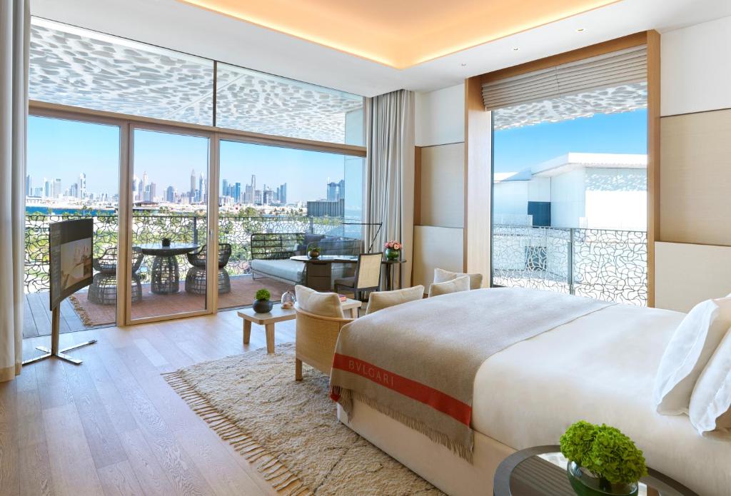 de deluxe suites (105 m²) en Bvlgari suites (120 m²) hebben een jacuzzi in de badkamer en ruimere terrassen
