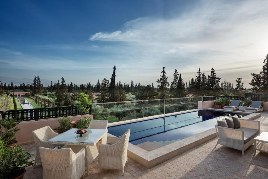 Royal Suite (175 m² + 145 m² buitenruimte) gelegen op de eerste verdieping met infinity zwembad, zicht over de tuinen en het Atlasgebergte, aparte living met open haard en slaapkamer